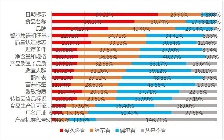 近七成消費(fèi)者在購買食品時(shí)有查看食品標(biāo)簽標(biāo)識的習(xí)慣,九成消費(fèi)者關(guān)注食品生產(chǎn)日期和保質(zhì)期,多數(shù)人希望保質(zhì)期以日期形式標(biāo)注。此外食品名稱和品牌的關(guān)注度也非常高,而產(chǎn)品標(biāo)準(zhǔn)代號、廠名廠址和生產(chǎn)許可證編號等信息關(guān)注者較少。