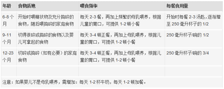 世衛(wèi)組織建議嬰兒在6個月大時(180天)開始接受除母乳之外的補充食物。食物應當是適當?shù)?,也就是說應當提供足夠的能量、蛋白質(zhì)和微量營養(yǎng)素以滿足兒童生長的營養(yǎng)需求。應當以安全的方式制備和喂給食物以便盡量減少污染的危險。喂養(yǎng)嬰幼兒需要給予積極的照護和激發(fā)以便鼓勵兒童進食。