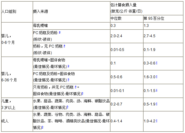 33. 2010年舉行的糧農(nóng)/世聯(lián)合專家會(huì)議估計(jì)了國(guó)際水平雙酚A的攝入量。專家把各種可能出現(xiàn)的膳食模式考慮在內(nèi),包括最壞膳食模式(包裝食品占總膳食100%)和最佳膳食模式(包裝食品占總膳食25%),并從特定文獻(xiàn)取得食品的雙酚A濃度數(shù)據(jù),從而計(jì)算出攝入量估值。16 糧農(nóng)/世衛(wèi)聯(lián)合專家會(huì)議得出各年齡組別的國(guó)際水平攝入量估值,均遠(yuǎn)低于由歐洲食品安全局定立的每日可容忍攝入量,每公斤體重0.05 毫克。這顯示從目前雙酚A的攝入量來(lái)看,各年齡組別面對(duì)的健康風(fēng)險(xiǎn)極低。表1總結(jié)了四個(gè)人口組別的估計(jì)膳食攝取量。