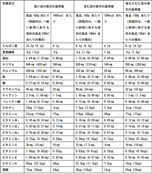 表2中列舉了聲稱“富含”、“含有”、“強化”的營養(yǎng)成分含量基準值。蛋白質和膳食纖維的強化聲稱,其含量高于強化基準值以上的同時,與其他產品保持25%以上相對差,所以適用新法之后聲稱“與我公司以往產品相比蛋白質含量提高了20%”是不合法的。