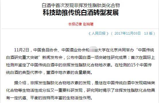 最近,微信上流傳著一個(gè)關(guān)于白酒的“重大研究成果”讓很多愛(ài)酒人士眼前一亮。大量媒體報(bào)道稱,最新的研究發(fā)現(xiàn):白酒中含有非揮發(fā)性脂肽化合物,具有抗癌、抗病毒、抗炎癥、抗氧化的作用。這從現(xiàn)代科學(xué)手段證實(shí)了白酒特殊的健康價(jià)值,對(duì)于整個(gè)產(chǎn)業(yè)有非常積極的影響。白酒真的能抗癌?