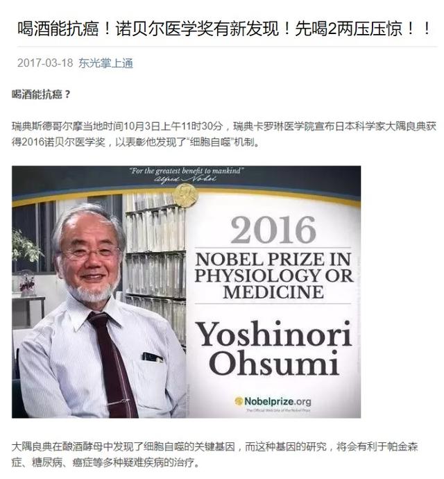 這是酒類(lèi)行業(yè)最常用的策略。通常的做法是聲稱飲酒與癌癥之間的關(guān)系非常復(fù)雜,暗示任何關(guān)于與癌癥直接相關(guān)性的證據(jù)都很弱,甚至是不存在的。然后通過(guò)提供曲解的信息,混淆公眾認(rèn)知,攪渾局面。比如今年早些時(shí)候就有酒商曲解大隅良典的研究,還稱獲得諾貝爾獎(jiǎng)也說(shuō)白酒可以抗癌。