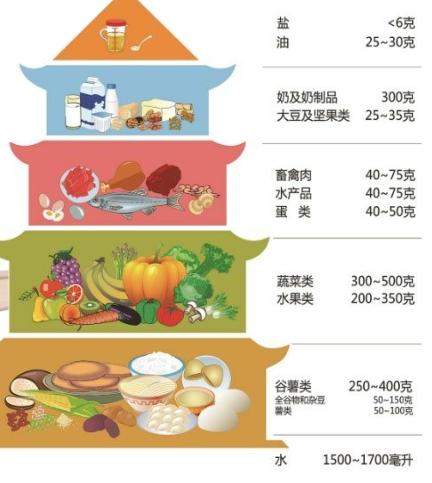 蔬菜保證每天攝入300至500克,深色蔬菜應(yīng)占1/2;水果保證每天攝入200至350克,果汁不能代替鮮果;奶制品攝入量相當(dāng)于每天液態(tài)奶300克;豆制品每天攝入量相當(dāng)于大豆25克以上,適量吃堅(jiān)果。