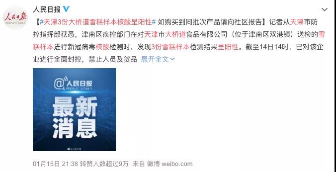 1月15日,天津大橋道3份雪糕檢出新冠病毒核酸陽(yáng)性……