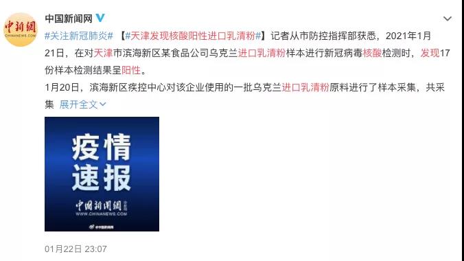 1月21日,天津發(fā)現(xiàn)核酸陽(yáng)性的進(jìn)口乳清粉……