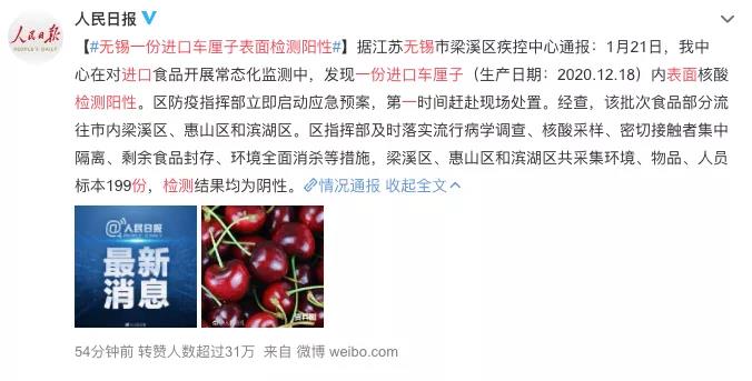 1月21日,江蘇無錫一份進(jìn)口車?yán)遄觾?nèi)表面新冠病毒檢測(cè)核酸陽(yáng)性……