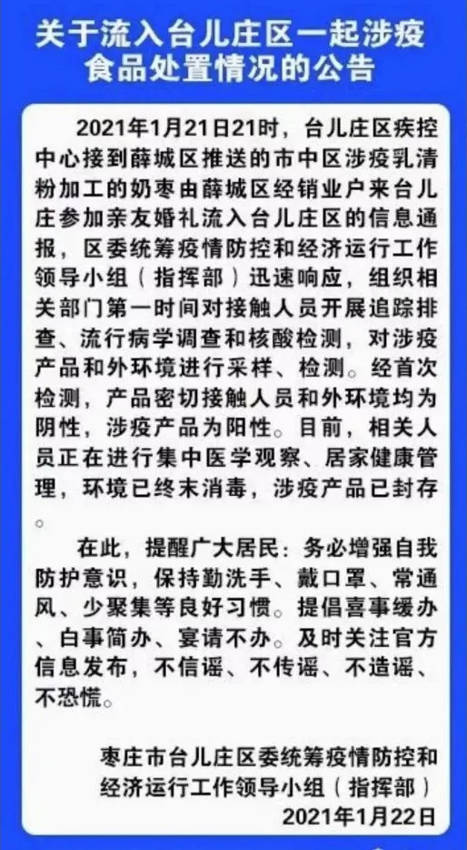 記者從山東省棗莊市臺兒莊區(qū)委統(tǒng)籌疫情防控和經(jīng)濟運行工作領(lǐng)導(dǎo)小組(指揮部)了解到,2021年1月21日21時,臺兒莊區(qū)疾控中心接到薛城區(qū)推送的市中區(qū)涉疫乳清粉加工的奶棗由薛城區(qū)經(jīng)銷業(yè)戶,來臺兒莊參加親友婚禮,流入臺兒莊區(qū)的信息通報,臺兒莊區(qū)委統(tǒng)籌疫情防控和經(jīng)濟運行工作領(lǐng)導(dǎo)小組(指揮部)迅速響應(yīng),組織相關(guān)部門第一時間對接觸人員開展追蹤排查、流行病學(xué)調(diào)查和核酸檢測,對涉疫產(chǎn)品和外環(huán)境進(jìn)行采樣、檢測。經(jīng)首次檢測,產(chǎn)品密切接觸人員和外環(huán)境均為陰性,涉疫產(chǎn)品為陽性。
