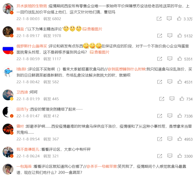 然而,評論區(qū)卻翻車了。網(wǎng)友幾乎一邊倒的罵監(jiān)管部門,包括一些很有影響力的大 V。很顯然,在西安封城期間盒馬鮮生不漲價、保供應是贏得了民心的。但是,你真覺得盒馬沒問題?