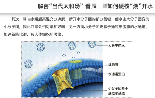 在營銷話語中,這樣的機理被演繹成了“高溫煮沸的水分子團更小”,然后進一步演繹成“水分子小,更容易吸收”。先不說小分子水是不是好吸收、是不是喝一口抵得上喝 10口,就說“小分子水”這么燙,怎么保溫?消費者又怎么喝?水一定要喝“熟”的嗎?