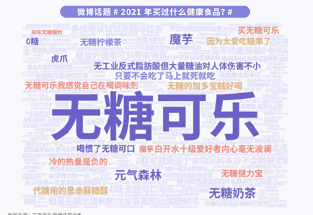 第三,2021的食品熱詞是“無糖飲料”,人們提到買得最多的品類是無糖飲料。而很多人開始選擇“無糖飲料”,其實(shí)也跟身材困擾有關(guān),不少人因?yàn)檎J(rèn)為“無糖飲料”能減肥、能幫助自己緩解身材困擾。