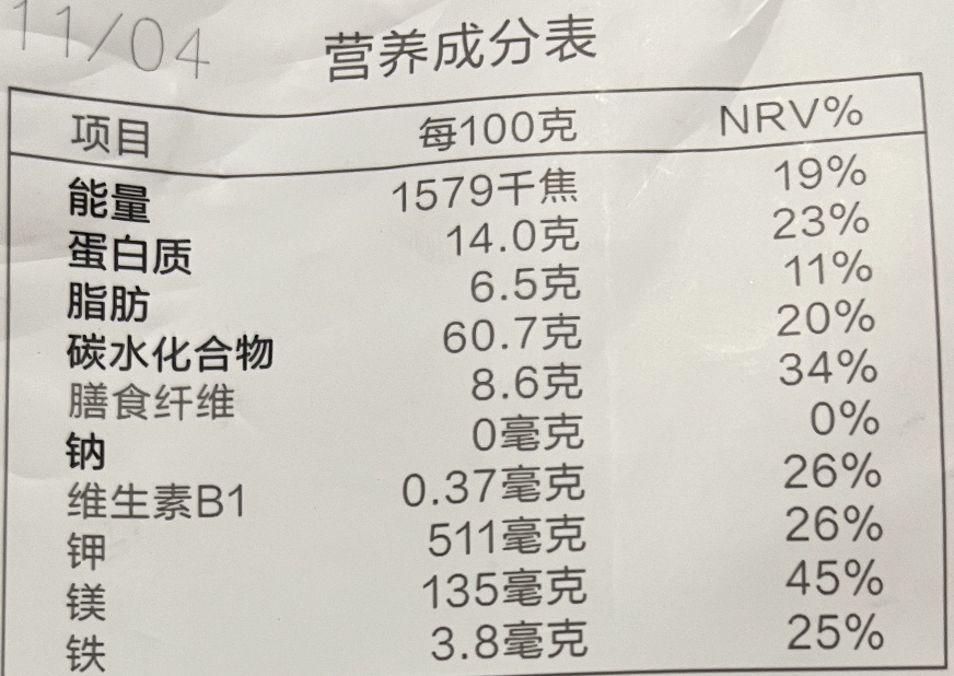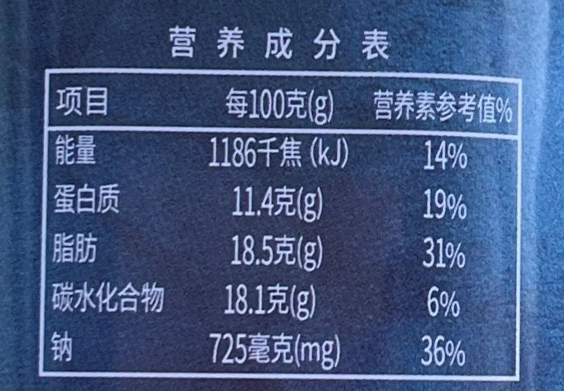 在營養(yǎng)標簽上,以每 100 克或每 100 毫升或每份食物中營養(yǎng)素含量占營養(yǎng)素參考值(NRV)的百分比來標示,營養(yǎng)素參考值百分比(NRV%)是《預包裝食品營養(yǎng)標簽通則》中的強制標示內容,表示 100 克或 100 毫升或一份食物所含的某種營養(yǎng)成分,提供了人體一天需求量的百分比。