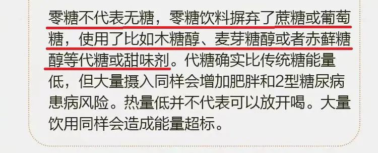 其中把“零糖不代表無糖”作為一個(gè)結(jié)論,然后解讀是“零糖飲料摒棄了蔗糖或者葡萄糖,使用了比如木糖醇、麥芽糖醇或者赤蘚糖醇等代糖或甜味劑”。