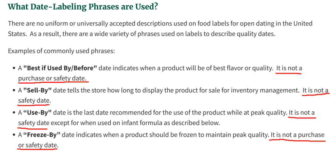 美國(guó)農(nóng)業(yè)部網(wǎng)站有個(gè)問答,詳細(xì)解釋了四種不同“日期”的含義,分別是最佳賞味期、銷售截止期、保存期(類似中國(guó)的保質(zhì)期)、冷凍保存期。無(wú)一例外都強(qiáng)調(diào)不是安全日期。