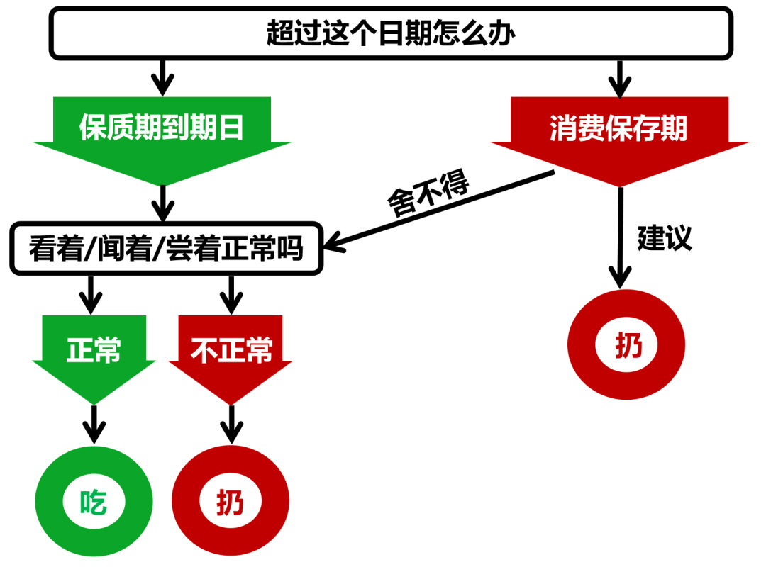 如果真有企業(yè)膽子大,標(biāo)了消費(fèi)保存期,應(yīng)該怎么看呢?這個(gè)圖可以供你參考。反正在我家,過不過期不重要,看著 / 聞著 / 嘗著正常,就接著吃唄 ~