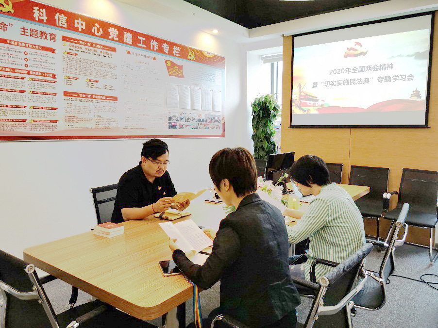 2020 年全國兩會(huì)精神暨“切實(shí)實(shí)施民法典”專題 學(xué)習(xí)會(huì),科信中心黨支部全體黨員參加會(huì)議。黨 支部書記吳桐主持會(huì)議并講話。會(huì)上,大家認(rèn)真 學(xué)習(xí)了十三屆全國人大三次會(huì)議、全國政協(xié)十三 屆三次會(huì)議精神。并逐一學(xué)習(xí)了政府工作報(bào)告、 全國人大涉港決定等重要文件。