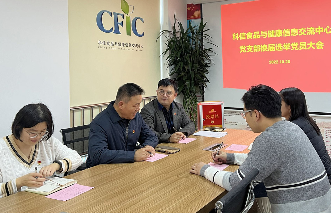 新當(dāng)選的支部書記、科信中心理事長包大躍同志代表新一屆黨支部負(fù)責(zé)人作表態(tài)發(fā)言,并對下一步工作進行安排部署。他在發(fā)言中指出,此次換屆工作注重突出形式與內(nèi)容、思想和業(yè)務(wù)的緊密結(jié)合,使支部的政治核心與戰(zhàn)斗堡壘作用進一步凸顯,支部利用換屆總結(jié)工作、梳理成績與不足、挖掘思想根源、明確發(fā)展和前進方向,讓整個換屆工作成為教育管理黨員的一堂生動思政實踐課,達(dá)到了很好的黨員教育管理效果。同時,他還提出希望全體黨員和新班子在新的起點上,發(fā)揚和繼承以往好經(jīng)驗、好做法的同時,著眼新時代新征程新任務(wù),與時俱進,務(wù)實創(chuàng)新,充分發(fā)揮戰(zhàn)斗堡壘作用和黨員的模范帶頭作用,團結(jié)帶領(lǐng)全體黨員堅定信仰守初心,嚴(yán)守紀(jì)律講規(guī)矩,立足主責(zé)主業(yè),注重黨建和業(yè)務(wù)的深度融合,積極探索黨支部標(biāo)準(zhǔn)化、規(guī)范化建設(shè),發(fā)揮黨建引領(lǐng)作用,協(xié)助政府相關(guān)部門在疫情防控、健康中國建設(shè)、食品安全社會共治、鄉(xiāng)村振興戰(zhàn)略等方面主動作為,不斷提升黨支部的組織力、戰(zhàn)斗力和凝聚力。