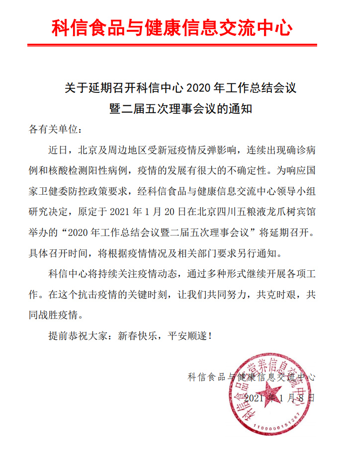 關(guān)于延期召開科信中心 2020 年工作總結(jié)會(huì)議暨二屆五次理事會(huì)議的通知