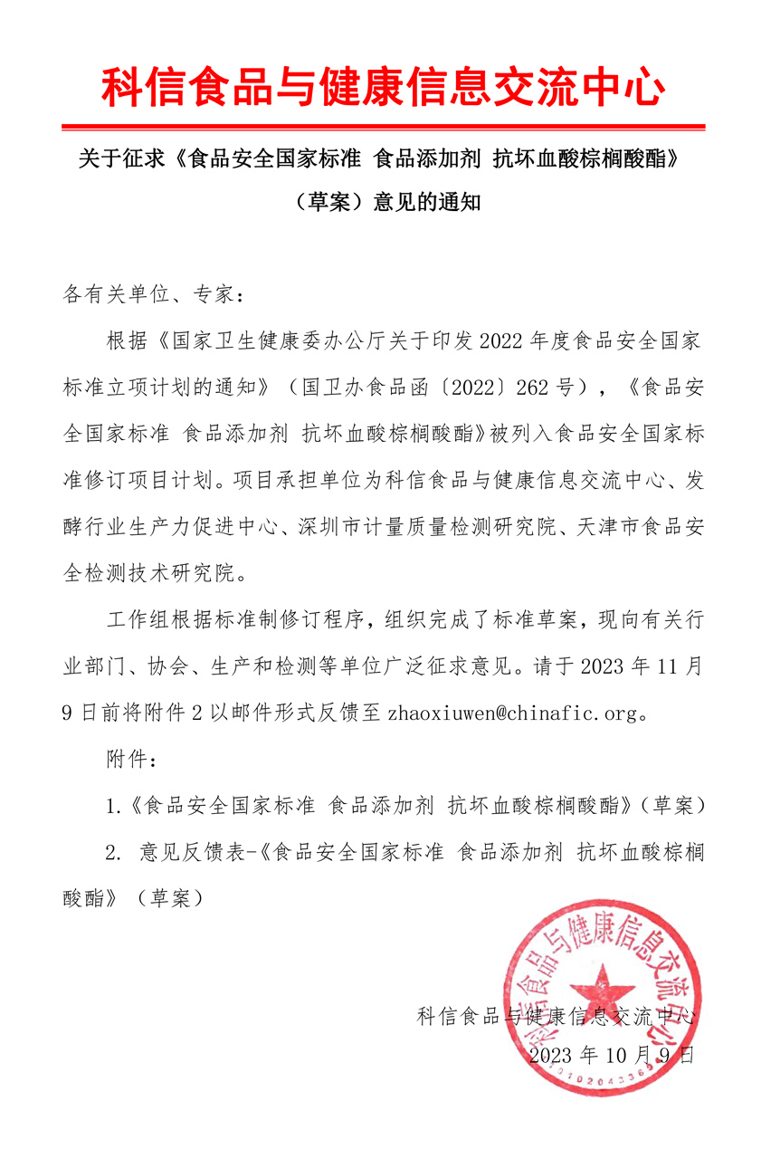 關于征求《食品安全國家標準 食品添加劑抗壞血酸棕櫚酸酯》(草案)意見的通知