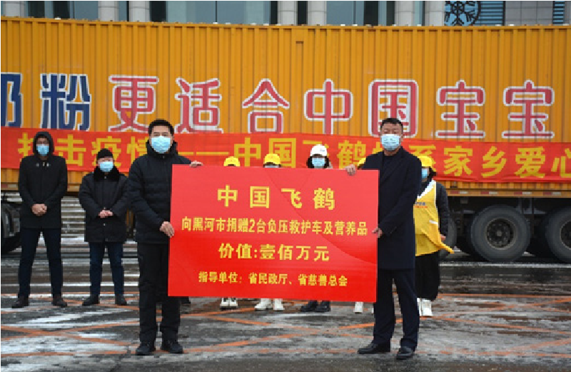 11 月 6 日,中國飛鶴根據(jù)抗疫實(shí)際需求,向黑河市捐贈價值 100 萬元的 2 臺負(fù)壓救護(hù)車及營養(yǎng)品,以實(shí)際行動助力黑河戰(zhàn)勝疫情。