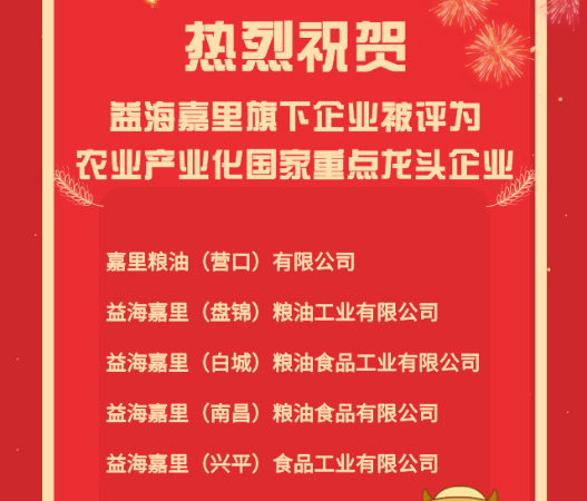 12 月 15 日,益海嘉里集團旗下 5 家企業(yè)被國家多部門聯合認定為農業(yè)產業(yè)化國家重點龍頭企業(yè)。它們分別是嘉里糧油(營口)有限公司、益海嘉里(盤錦)糧油工業(yè)有限公司、益海嘉里(白城)糧油食品工業(yè)有限公司、益海嘉里(南昌)糧油食品有限公司和益海嘉里(興平)食品工業(yè)有限公司。