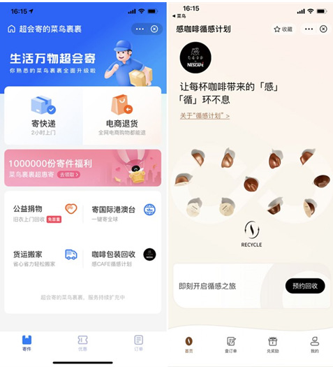 近日,菜鳥 APP“寄萬(wàn)物”功能再次升級(jí),除貨運(yùn)搬家、公益回收之外上線“包裝回收”專區(qū),雀巢旗下“感 café”成為其首個(gè)入駐的合作咖啡品牌。 今后,“感 café”的消費(fèi)者可通過(guò)菜鳥裹裹物流服務(wù)免費(fèi)預(yù)約快遞員上門回收咖啡包裝,這也是 2021 年 6 月雀巢與菜鳥升級(jí)綠色供應(yīng)鏈戰(zhàn)略合作后落地的首個(gè)綠色項(xiàng)目。