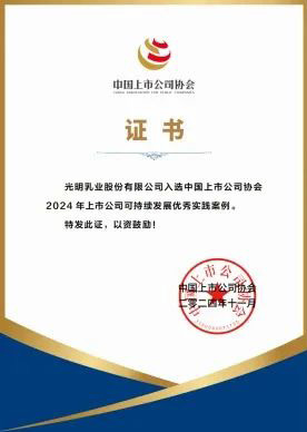 近日,光明乳業(yè)憑借在 ESG 方面的優(yōu)秀表現(xiàn),從中脫穎而出,榮獲 2024 中國企業(yè)ESG“金責(zé)獎(jiǎng)”公司治理責(zé)任優(yōu)秀企業(yè)榮譽(yù)。