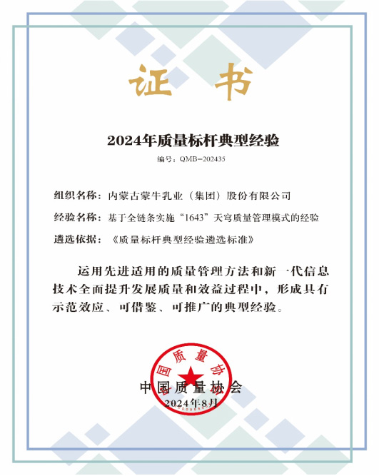 8月15日,中國質(zhì)量協(xié)會(huì)正式發(fā)布“2024 年質(zhì)量標(biāo)桿典型經(jīng)驗(yàn)”,蒙牛集團(tuán)提報(bào)的“基于全鏈條實(shí)施‘1643’天穹質(zhì)量管理模式的經(jīng)...