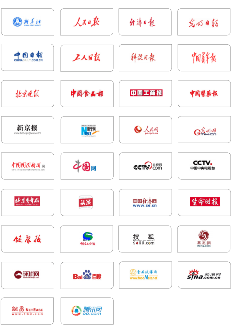 吸納在網(wǎng)絡(luò)、電視和平面影響較大的媒體和食品與營養(yǎng)專業(yè)報(bào)刊參加,如央視、人民日?qǐng)?bào)、新華網(wǎng)、中經(jīng)網(wǎng)、新浪網(wǎng)、搜狐網(wǎng)、網(wǎng)易網(wǎng)、鳳凰網(wǎng)、中國食品安全報(bào)、食品伙伴網(wǎng)等共 60 家。